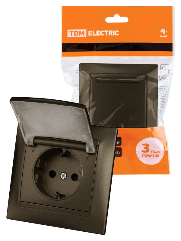 Влагозащищенная розетка электрическая IP44 TDM со шторками с откидной крышкой с рамкой (Бронза)