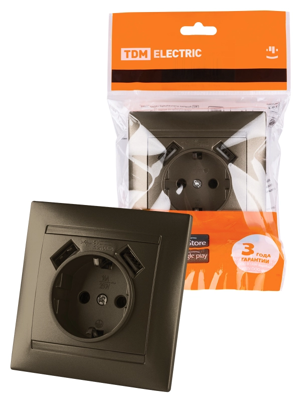 Розетка 2П+З 16А 250В + 2 USB порта 2,1А 5В бронза "Лама" TDM