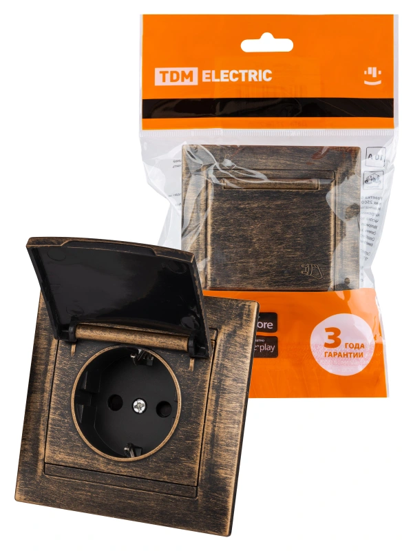Влагозащищенная розетка электрическая IP44 TDM со шторками с откидной крышкой с рамкой (Старинная бронза)