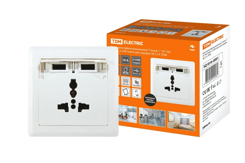 Блок мультифункциональный "Сенеж 1" 2П 10А 250В + 2 USВ-порта для зарядки 5В 2,1А белый TDM