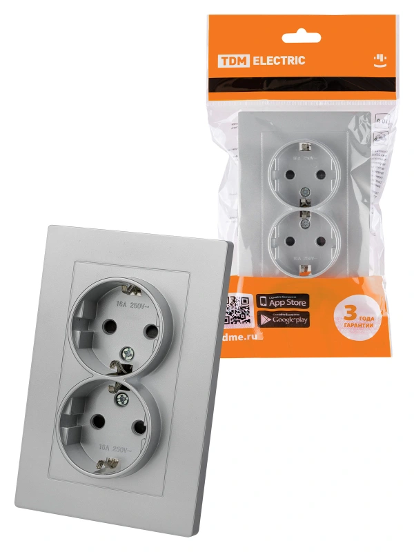 Розетка двойная 2П+З 16А 250В с защ. шт. серебр. металлик "Сенеж" TDM