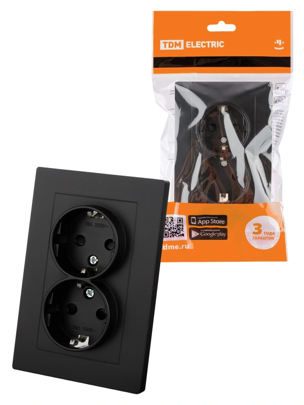 Розетка двойная 2П+З 16А 250В с защ. шт. черная "Сенеж" TDM