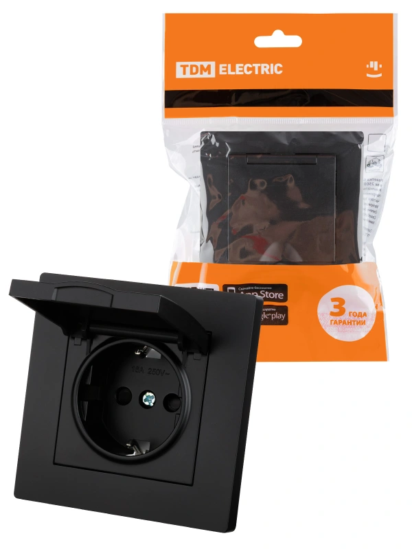 Розетка 2П+З 16А 250В IP44 с защ. шт. с крышкой черная "Сенеж" TDM