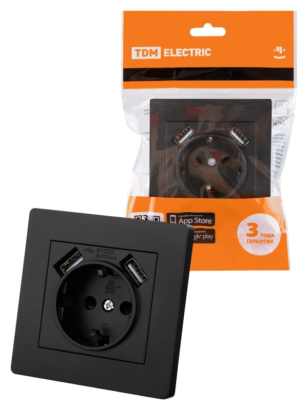 Розетка 2П+З 16А 250В + 2 USB порта 2,1А 5В черная "Сенеж" TDM