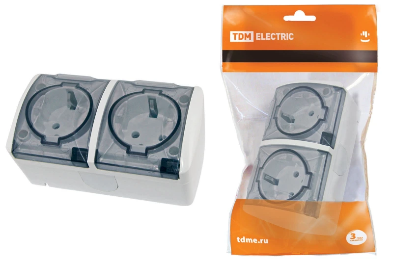Розетка двойная 2П+3 открытой установки IP54 16А с прозрачной крышкой белая "Селигер" TDM