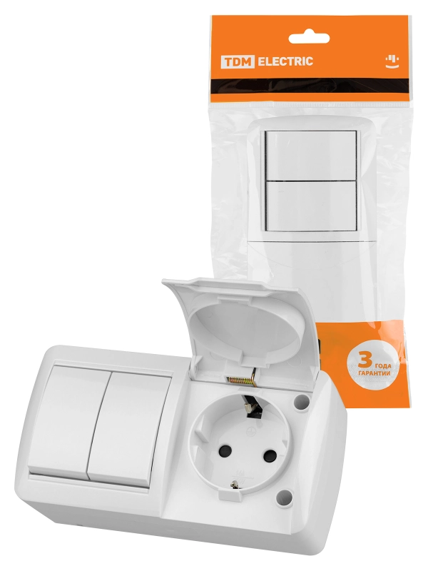 Блок выключатель 2-клавишный 10А + розетка 2П+З 16А с защитными шторками с крышкой IP54 белый "Селигер" TDM