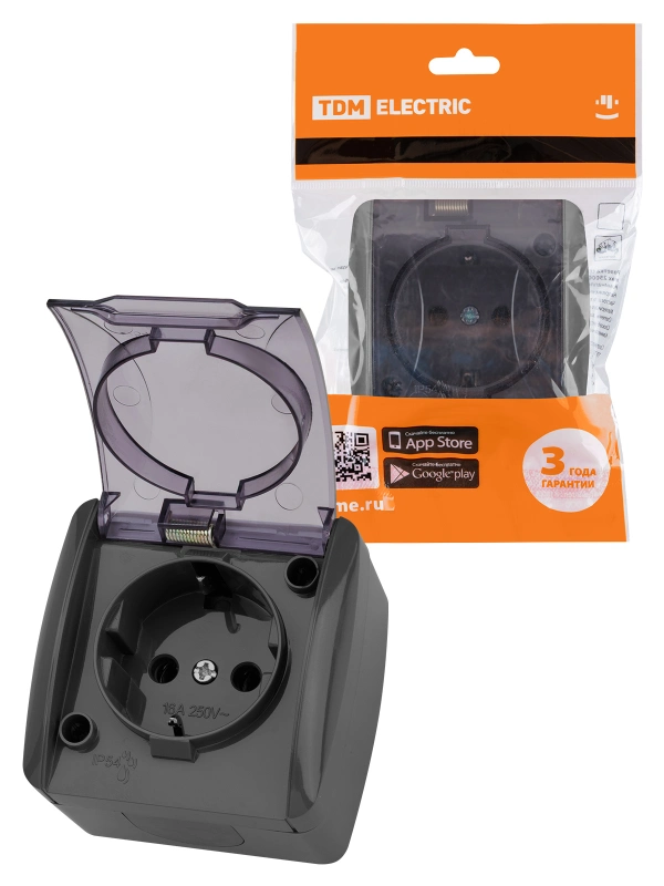 Розетка 2П+3 открытой установки IP54 16А с прозрачной крышкой серая "Селигер" TDM
