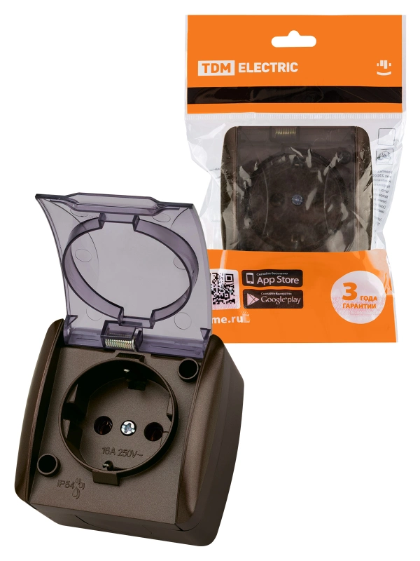 Розетка 2П+3 открытой установки IP54 16А с прозрачной крышкой шоколад "Селигер" TDM