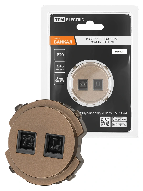 Розетка телефонная RJ11 + компьютерная RJ45 бронза, "Байкал" TDM