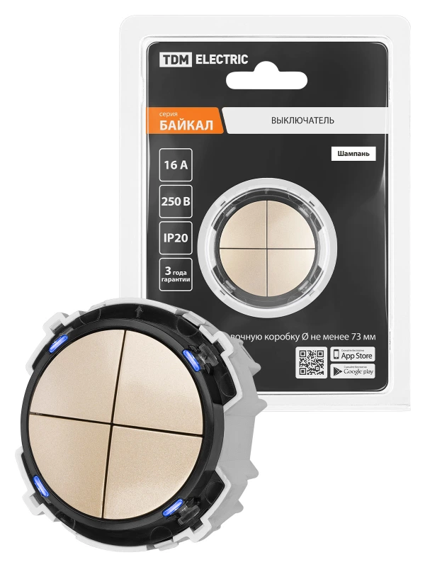 Выключатель 4-кл. 16А 250В проходной кнопочный механизм шампань, "Байкал" TDM