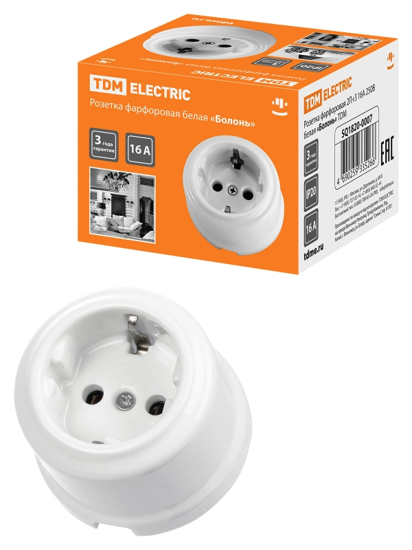 Розетка фарфоровая 2П+З 16А 250В белая «Болонь» TDM