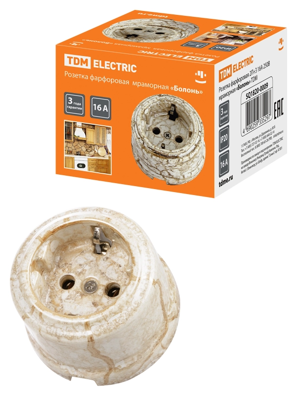 Розетка фарфоровая 2П+З 16А 250В мраморная «Болонь» TDM