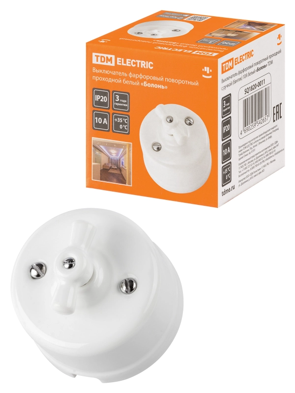 Выключатель фарфоровый поворотный проходной с ручкой (бантик) 10А белый «Болонь» TDM