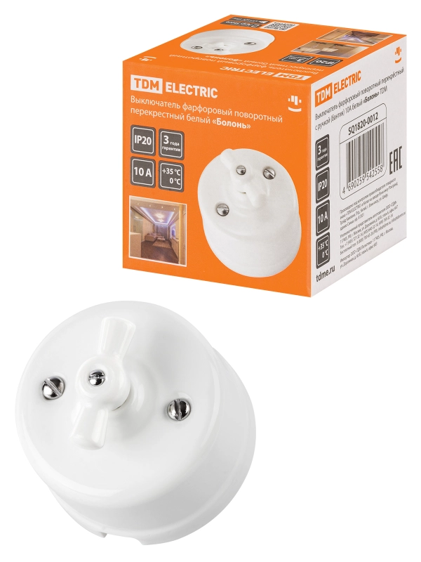 Выключатель фарфоровый поворотный перекрёстный с ручкой (бантик) 10А белый «Болонь» TDM