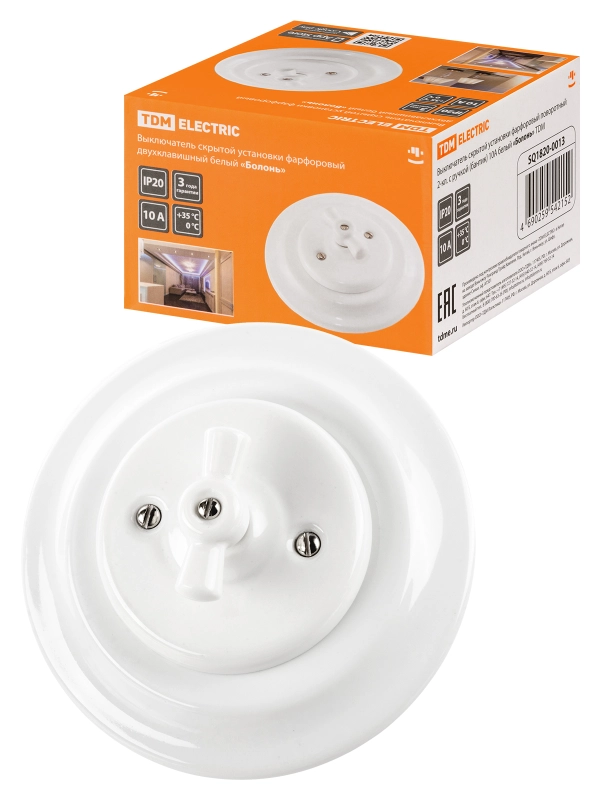 Выключатель скрытой установки фарфоровый поворотный 2-кл. с ручкой (бантик) 10А белый «Болонь» TDM