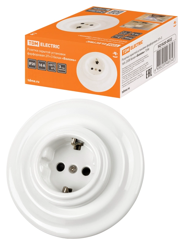 Розетка скрытой установки фарфоровая 2П+З 16А 250В белая «Болонь» TDM