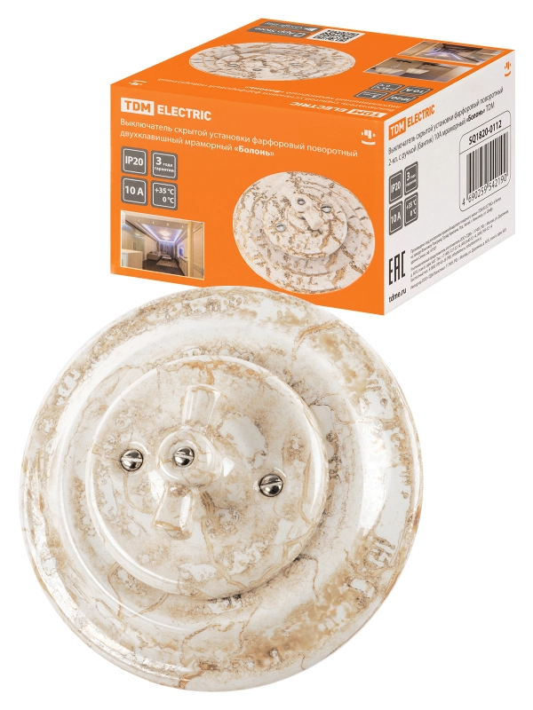 Выключатель скрытой установки фарфоровый поворотный 2-кл. с ручкой (бантик) 10А мраморный «Болонь» TDM