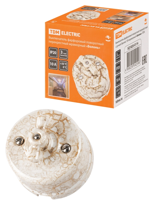 Выключатель фарфоровый поворотный перекрёстный с ручкой (бантик) 10А мраморный «Болонь» TDM
