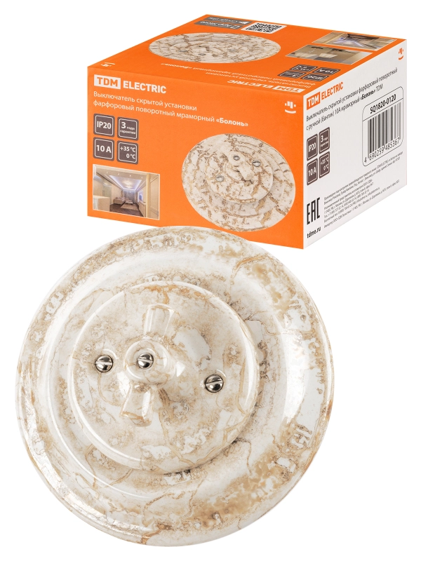 Выключатель скрытой установки фарфоровый поворотный с ручкой (бантик) 10А мраморный «Болонь» TDM