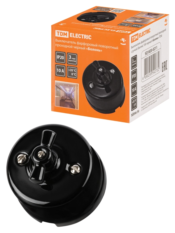 Выключатель фарфоровый поворотный проходной с ручкой (бантик) 10А черный «Болонь» TDM