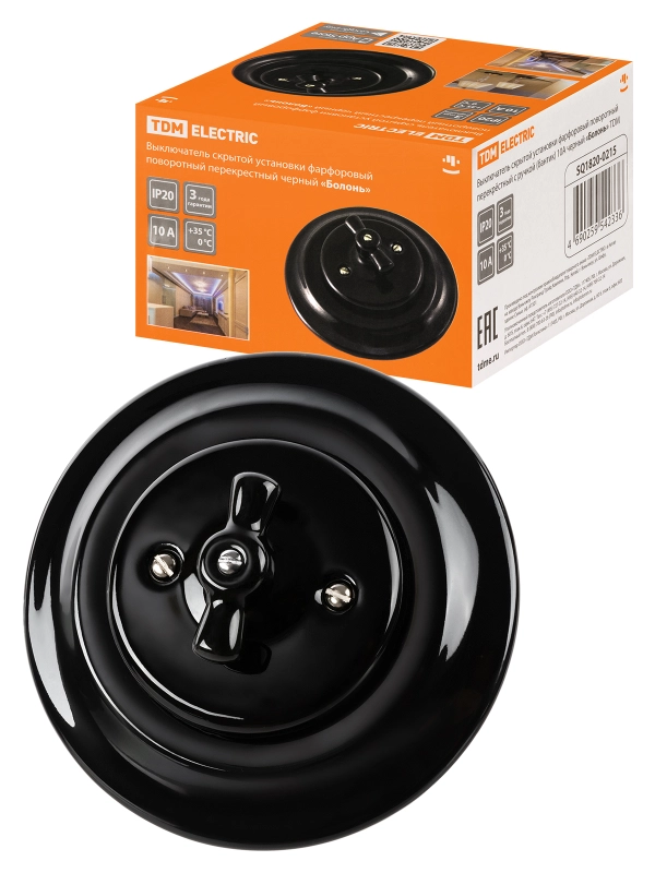 Выключатель скрытой установки фарфоровый поворотный перекрёстный с ручкой (бантик) 10А черный «Болонь» TDM