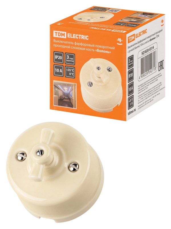 Выключатель фарфоровый поворотный проходной с ручкой (бантик) 10А сл. кость «Болонь» TDM