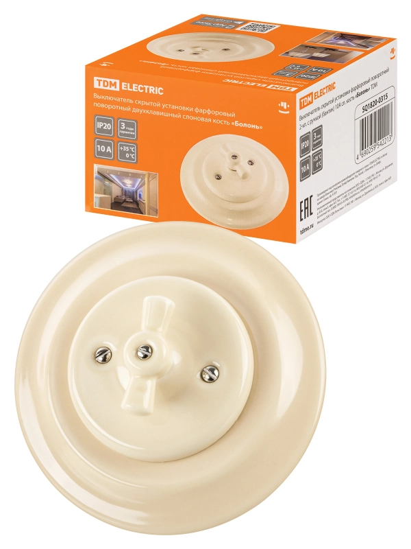 Выключатель скрытой установки фарфоровый поворотный 2-кл. с ручкой (бантик) 10А сл. кость «Болонь» TDM
