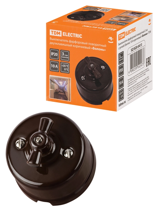 Выключатель фарфоровый поворотный 2-кл. с ручкой (бантик) 10А коричневый «Болонь» TDM