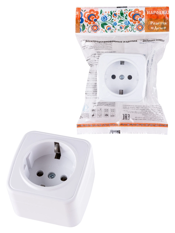 Розетка 2П+З открытой установки IP20 16А, белая "Дача" Народная