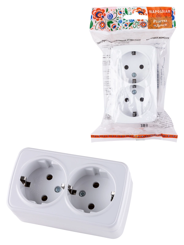Розетка двойная 2П+3 открытой установки IP20 16А, белая "Дача" Народная