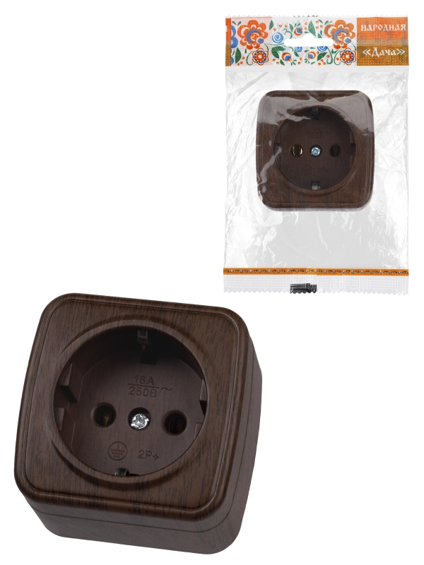 TDM Розетка 2П+З открытой установки IP20 16А, венге "Дача" Народная
