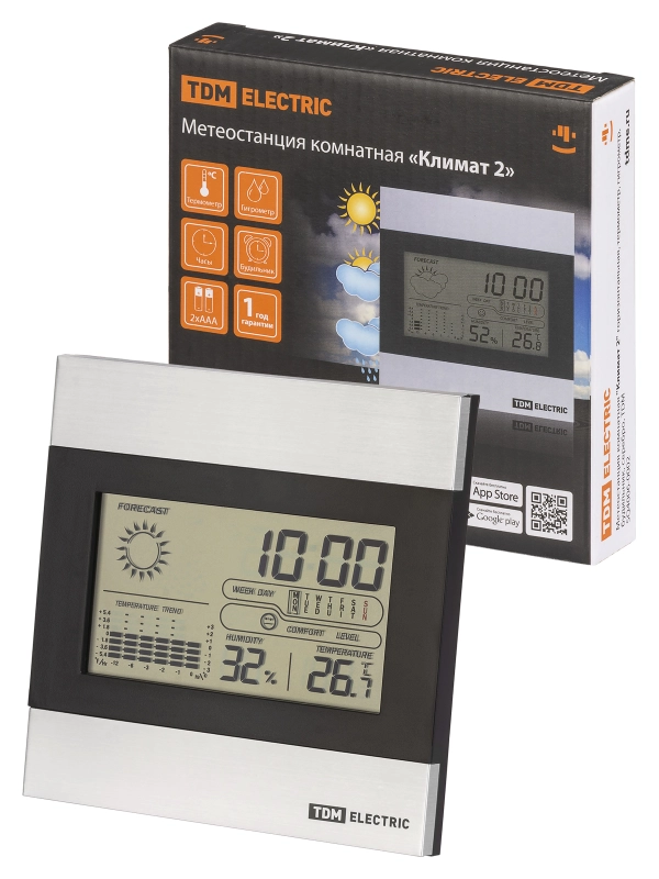 Метеостанция комнатная "Климат 2" горизонтальная, термометр, гигрометр, будильник, серебро, TDM
