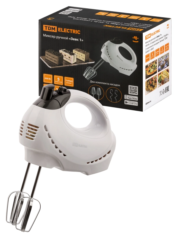 Миксер ручной «Зевс 1», 200 Вт, 5 скоростей, режим «Турбо», 2 комплекта насадок, белый, TDM
