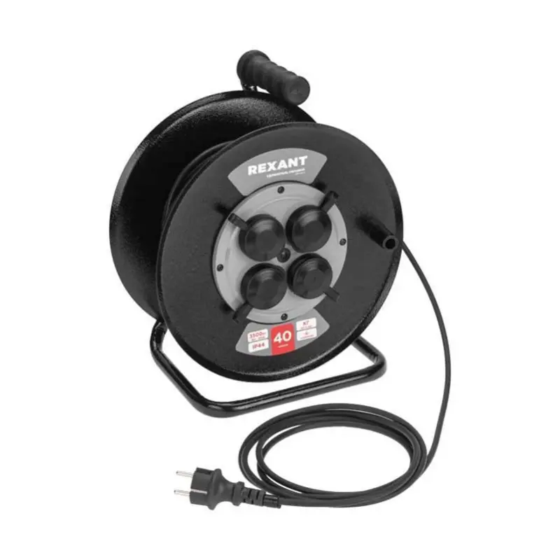 Удлинитель силовой КГ на катушке 4 гнезда, с/з, 40м, 3х1,5мм?, IP44 c защитными крышками, металлическая катушка REXANT 13-5012