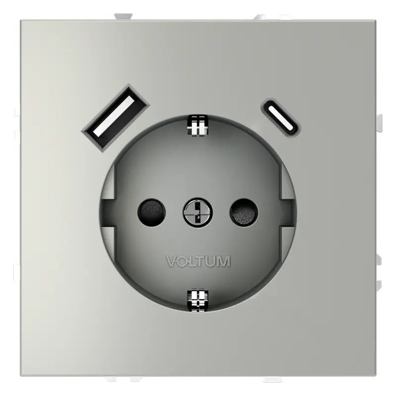 Розетка встраиваемая VOLTUM S70 с заземлением и защитными шторками, 16А, с USB, A+С, (сталь)