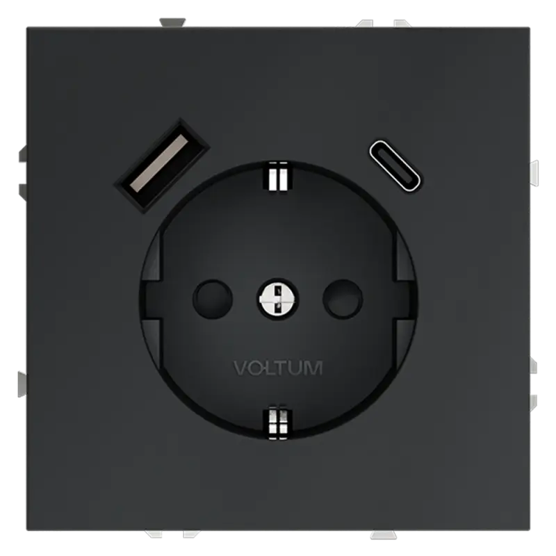 Розетка встраиваемая VOLTUM S70 с заземлением и защитными шторками, 16А, с USB, A+С, (графит)