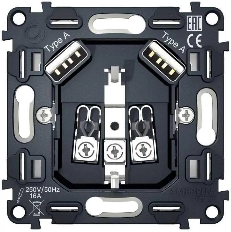 Механизм электрической розетки 2USB A+A 18W (быстрая зарядка) с заземлением на винтовых зажимах 16A-250V QUANT VM155