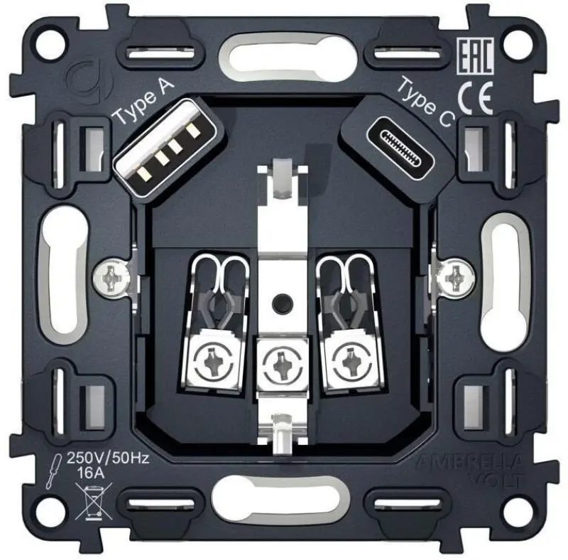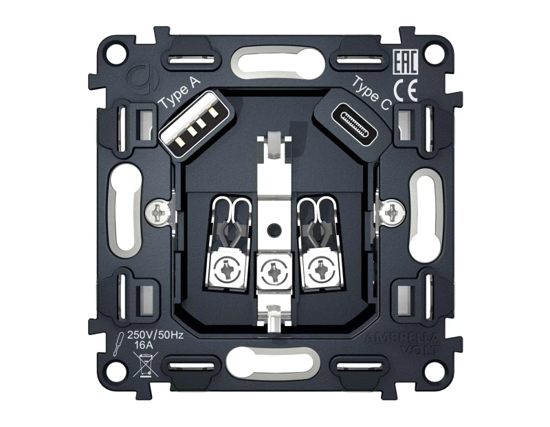 Механизм электрической розетки 2USB A+C 20W (быстрая зарядка) с заземлением на винтовых зажимах 16A-250V QUANT VM160