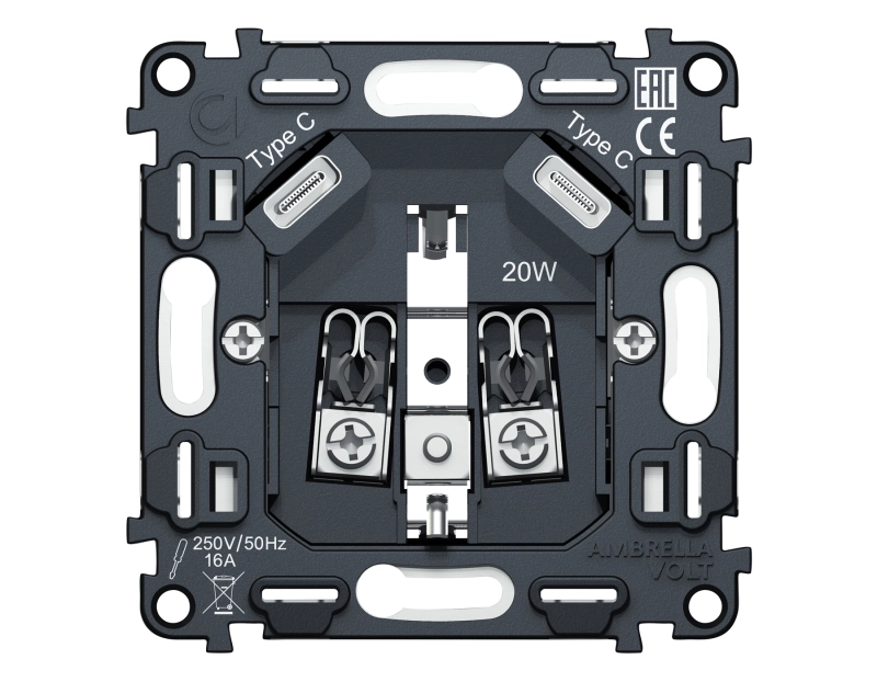 Механизм электрической розетки 2USB С+C 20W (быстрая зарядка) с заземлением на винтовых зажимах 16A-250V QUANT VM165